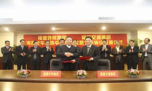 2011年12月31日下午,外貿集團與交通集團簽署海西汽車物流平臺建設和運營合作框架協議。省政府國資委黨委副書記、常務副主任林寶金出席了簽字儀式。此次雙方從海西發展戰略高度出發,以大國資合作主導為前提,本著優勢互補、共同發展的原則,通過深層次的戰略合作,充分發揮各自的資源優勢,共同營造優質高效、優惠便捷的福州港江陰港區汽車整車進口經營環境,推動“海西汽車物流平臺”項目盡快建成運營并形成規模效益,促進閩臺產業深度對接和兩岸經貿交流合作的進一步發展。