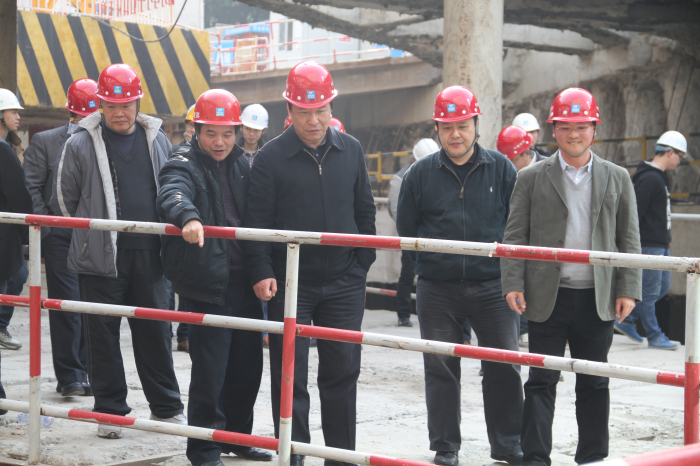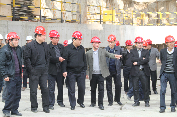 海西商務(wù)大廈項(xiàng)目承建方中建海峽發(fā)展有限公司總經(jīng)理江建瑞(右四)陪同集團(tuán)張忠董事長(zhǎng)(左四)、陳軍華總經(jīng)理(左二)等集團(tuán)領(lǐng)導(dǎo)視察工地