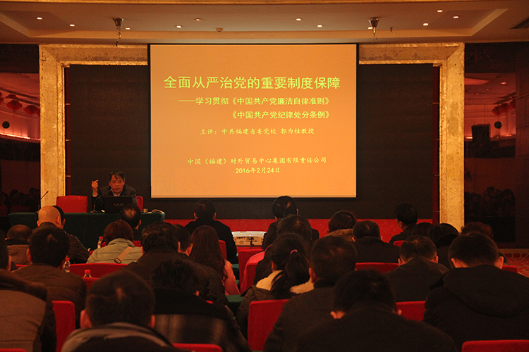 為切實做好《中國共產黨廉潔自律準則》和《中國共產黨紀律處分條例》的學習貫徹,近日,外貿集團邀請福建省委黨校郭為桂教授舉辦了“全面從嚴治黨的重要制度保障”專題輔導講座,集團領導班子成員、集團在榕單位全體黨員、各公司班子成員共143人參加了學習活動。郭為桂教授對《中國共產黨廉潔自律準則》和《中國共產黨紀律處分條例》進行了深入分析講解,集團廣大黨員通過黨課進一步深刻理解、全面掌握了各項廉潔自律規范和黨的紀律要求,增強了黨員干部的紀律觀念和廉潔自律意識,提高了嚴格執行中央八項規定精神、主動踐行“三嚴三實”的自覺性,為培養文明禮貌、勤奮工作和廉潔自律 “三個良好習慣”,打造產業優、機制活、盈利好、后勁足、實力強的外貿集團奠定堅實的思想基礎。