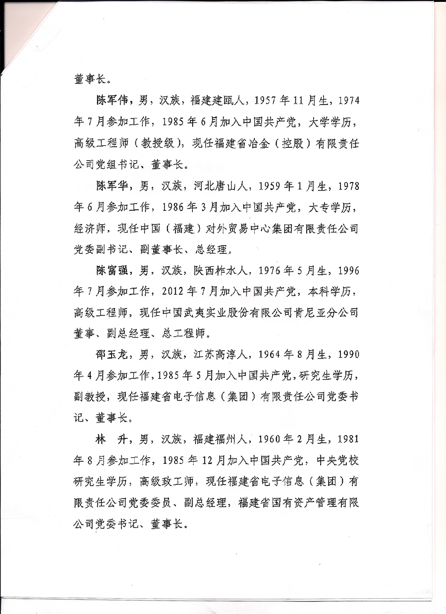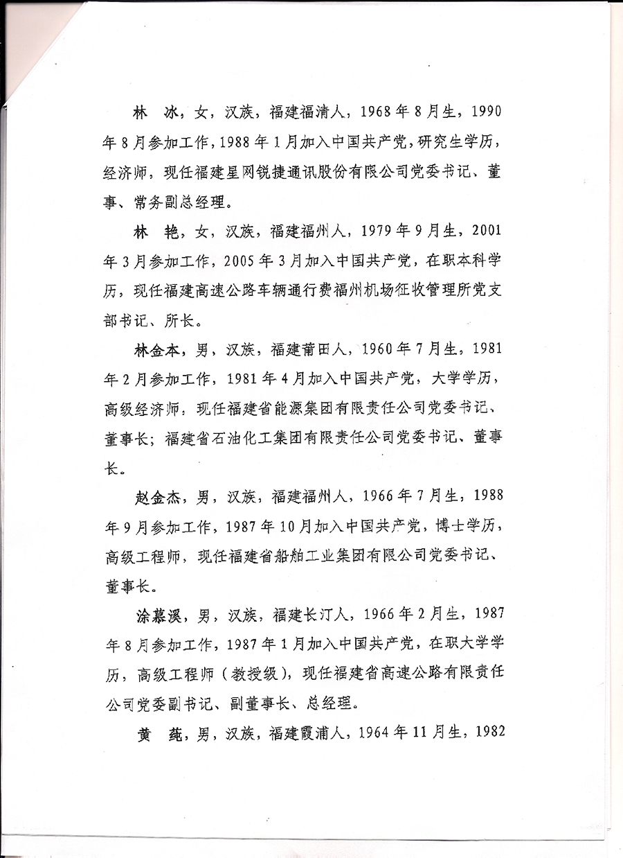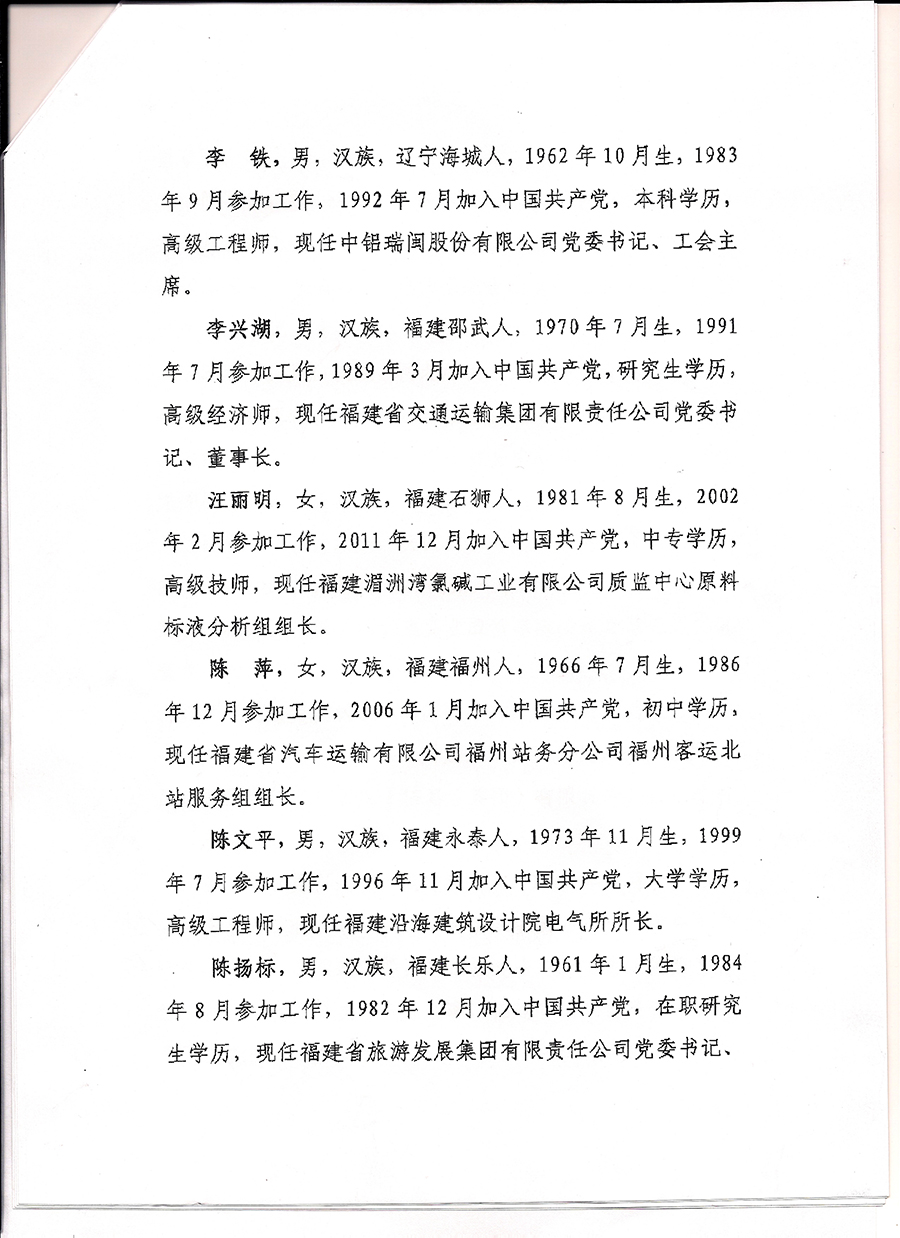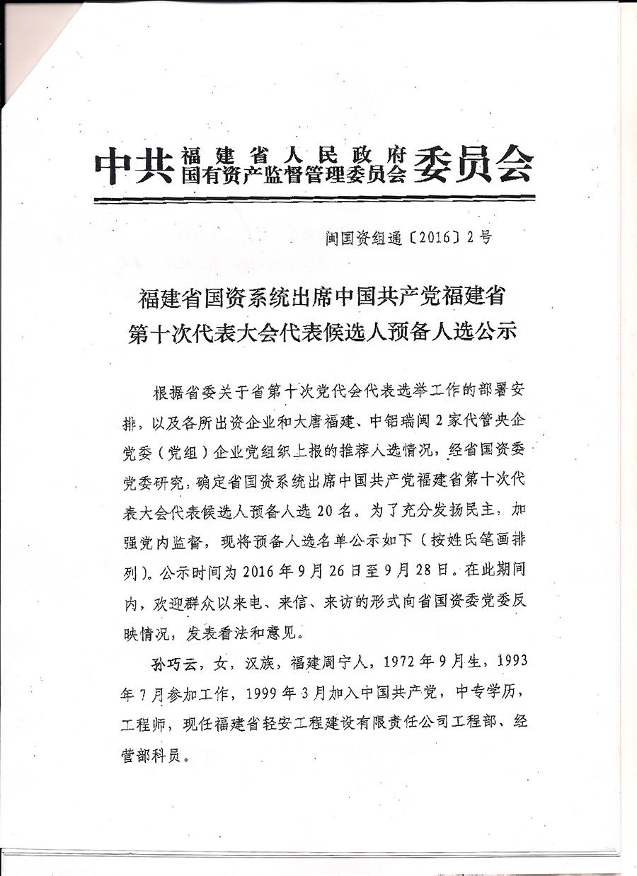 福建省國(guó)資委系統(tǒng)出席中國(guó)共產(chǎn)黨福建省第十次代表大會(huì)代表候選人預(yù)備人選公示