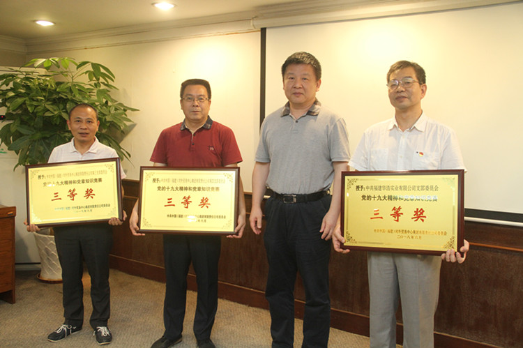 會上,首先為榮獲省屬企業優秀共產黨員、優秀黨務工作者和先進基層黨組織稱號的單位和個人頒獎,其中漳州公司黨總支榮獲“省屬企業先進基層黨組織”稱號,段軍東、徐良才同志榮獲“省屬企業優秀共產黨員”稱號,郭東亮、諶春順同志榮獲“省屬企業優秀黨務工作者”稱號。之后,表彰了集團“黨的十九大精神和黨章知識競賽”獲獎單位,其中漳州公司黨總支榮獲一等獎,華欣公司、隆發公司黨支部獲得二等獎,集團第四黨支部、集團第三黨支部、華浩公司黨支部獲得三等獎。