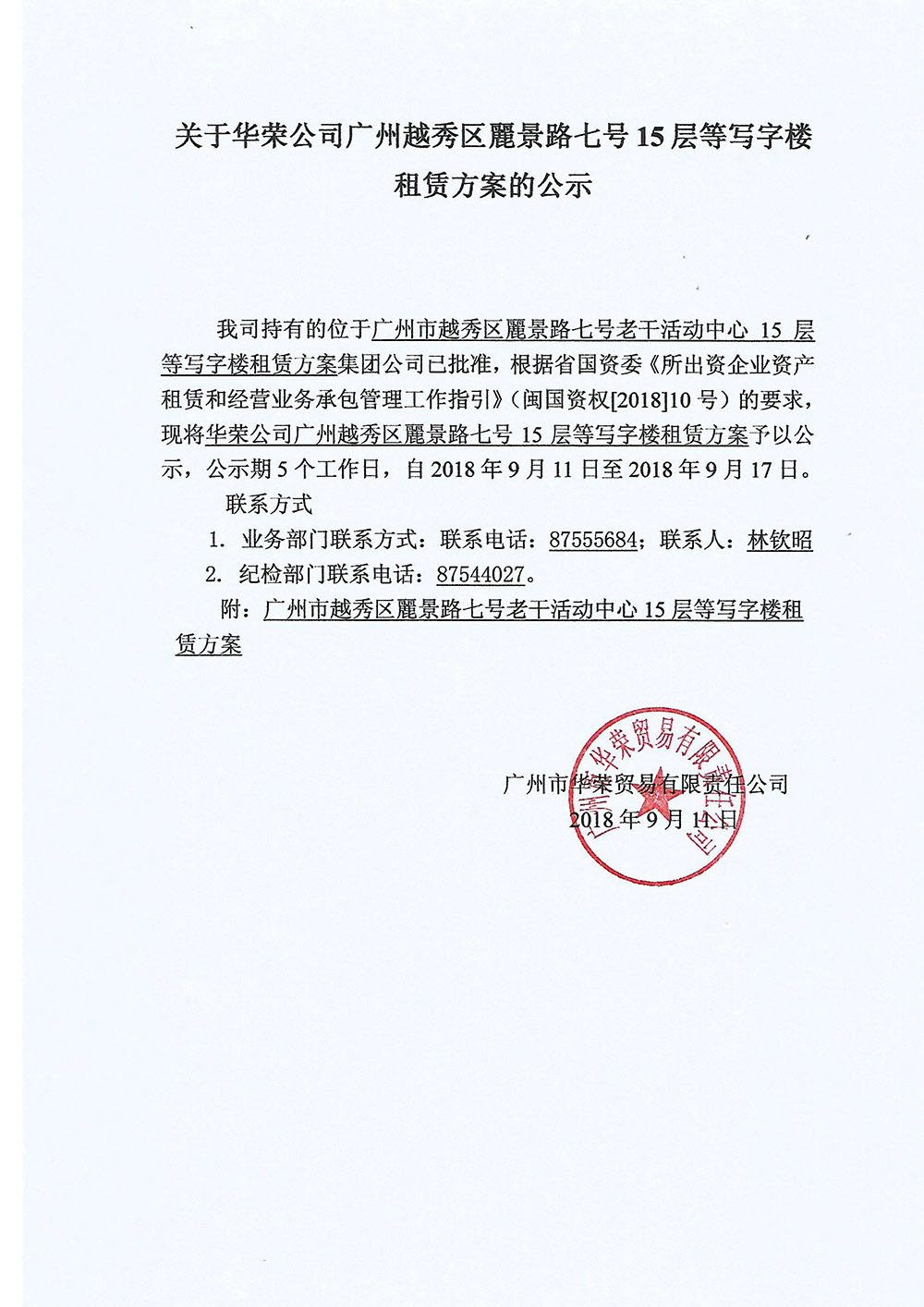 華榮公司廣州越秀區麗景路七號15層等寫字樓租賃方案的公示
