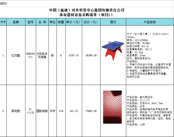 一、項(xiàng)目名稱(chēng):中國(guó)(福建)對(duì)外貿(mào)易中心集團(tuán)有限責(zé)任公司“職工之家”體育器材設(shè)備采購(gòu)項(xiàng)目(項(xiàng)目1:體育器材設(shè)備采購(gòu);2、乒乓球燈光設(shè)備采購(gòu))。