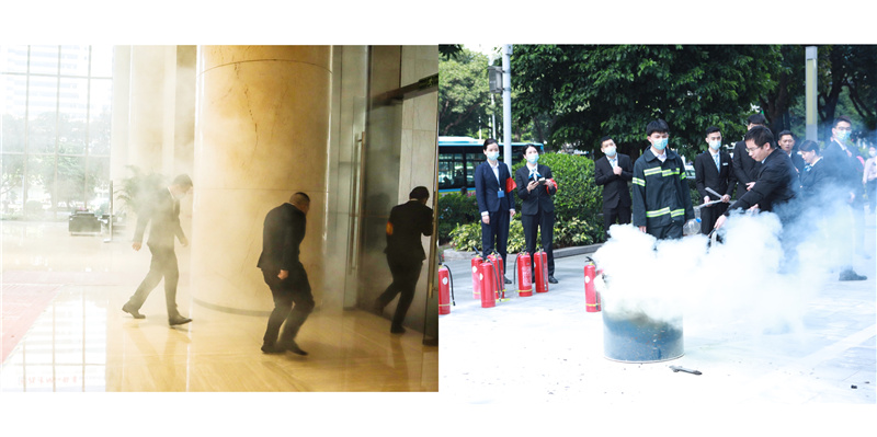 上午9點(diǎn)30分,隨著一陣急促的消防警報(bào)聲響起,逃生人員在規(guī)定的時(shí)間內(nèi)有序撤離到大廈西側(cè)廣場(chǎng),整個(gè)疏散過(guò)程緊張有序。疏散結(jié)束,由安管員進(jìn)行消防服穿戴及水帶連接展示,隨后詳細(xì)介紹了防毒面具佩戴及干粉滅火器的使用,并邀請(qǐng)?jiān)趫?chǎng)職工進(jìn)行防毒面具試戴及滅火實(shí)操體驗(yàn)。