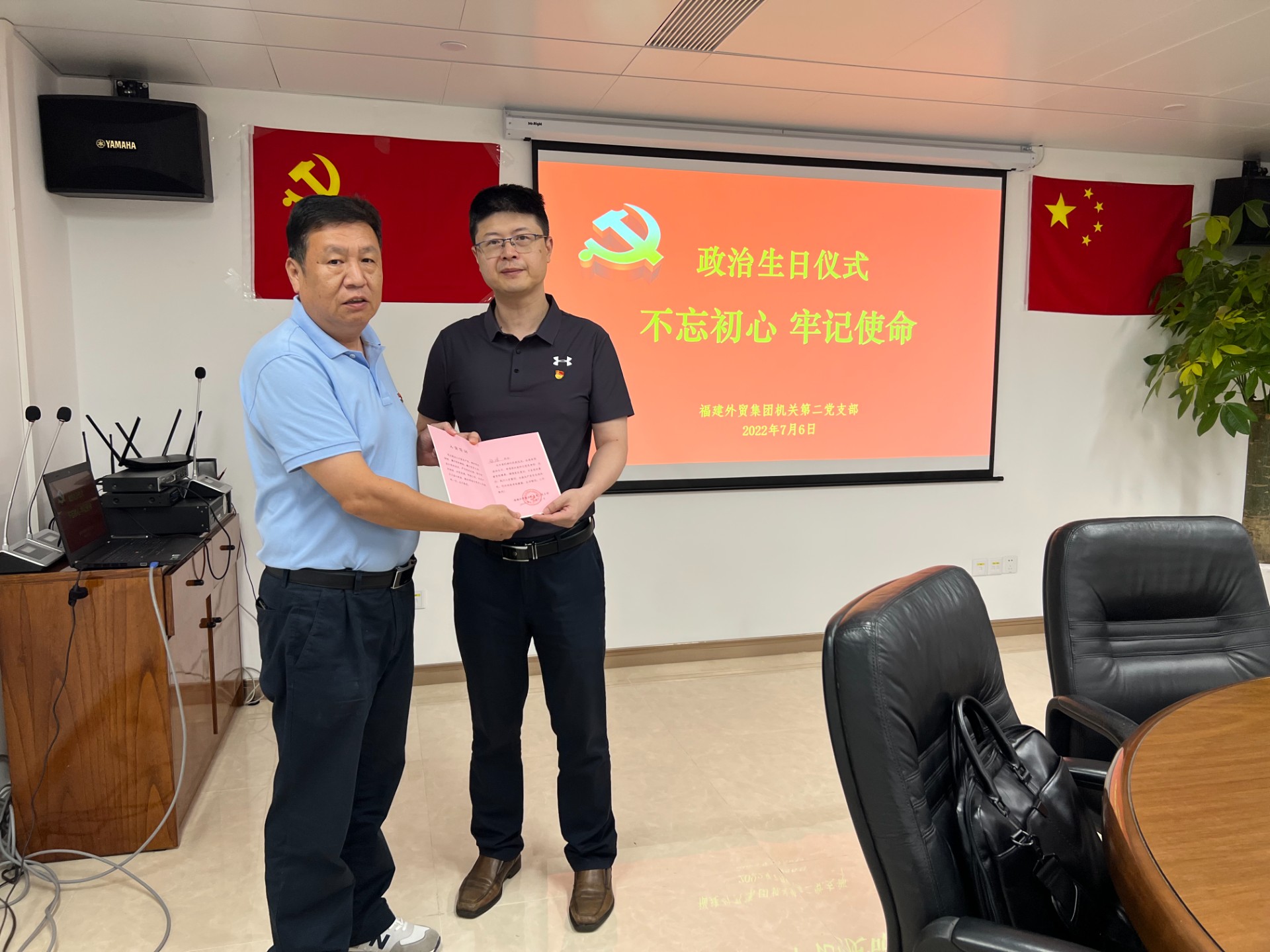 根據集團黨委統一部署,外貿集團機關第二黨支部于7月6日開展“紀念建黨101周年,同心喜迎二十大”系列活動,支部全體黨員到會參加。會上,支部為臨近7月入黨的兩位同志舉行了政治生日儀式,全體黨員在黨旗下莊重地舉起右手重溫入黨誓詞。隨后支部開展了《閩山閩水物華新-習近平福建足跡》主題學習活動,兩位黨員分別領讀了《國企改革攻堅》、《七下晉江,調研總結“晉江經驗”》兩篇文章。在學習的過程中,黨員們交流了學習心得和體會,大家表示通過開展政治生日、重溫入黨誓詞儀式以及對相關教育書籍的學習,進一步強化了黨員身份意識,堅定了理想信念,增強了黨員的使命感和責任感;同時通過學習進一步加深對習近平新時代中國特色社會主義思想的感悟和理解,特別是對習近平總書記在福建工作期間開創的重要理念和重大實踐有了進一步認識和體會,大家將以實際行動不斷增強擁護“兩個確立”的思想自覺、政治自覺、行動自覺,不斷增強“四個意識”,堅定“四個自信”,做到“兩個維護”,為集團高質量發展做出自己應有貢獻,以實際行動迎接二十大勝利召開。
